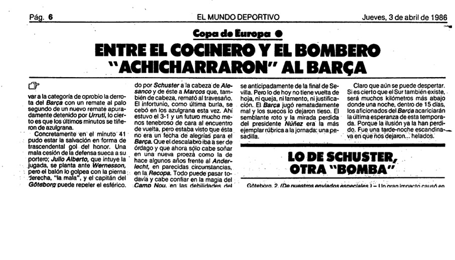 En 1986 el IFK se había colado por primera vez en semifinales de la Copa de Europa tras eliminar al Trakia Plovdiv búlgaro, al Fenerbahce y al entonces poderoso Aberdeen escocés. El Barcelona había tenido un camino más duro, deshaciéndose del Sparta de Praga, Porto y Juventus.