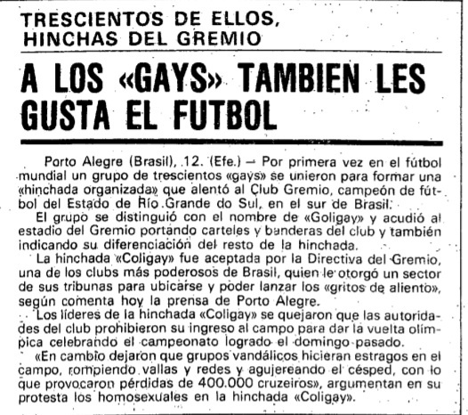 En 1977 un grupo de aficionados de Gremio de Porto Alegre se reunían con frecuencia en el bar “Coliseu” de la ciudad gaúcha. Charlaban, supongo, de fútbol y de sus trabajos. De sus vidas y de sus amores. De su realidad. Como todos. Eran gays. Una condición que no resultaba fácil de exhibir en un país con una dictadura militar.