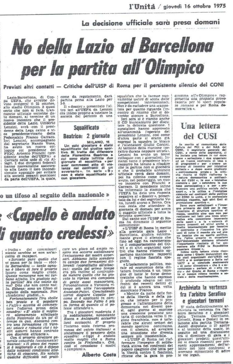 Y, en mitad de toda esta tensión, el sorteo de la Copa de la UEFA del 3 de octubre de ese 1975 junta en dieciseisavos a un club español -el FC Barcelona- con uno italiano -la Lazio-. El choque de ida, a disputar en el Olímpico, estaba fechado el 22 de octubre. Sin embargo, la izquierda italiana consideraba inadmisible que un equipo de la Liga visitara su país. Para avivar la chispa, Paese Sera, un diario de inspiración comunista, recordó que -a pesar de que ya en el Nou Camp aparecían senyeras en la grada- en 1974 el presidente del club culé Agustín Montal y toda la directiva acudieron a visitar a Franco para entregarle la Medalla de Honor de las Bodas de Platino del Club. Relata Alfredo Relaño que fueron todos los directivos salvo el vicepresidente Raimon Carrasco porque su padre fue fusilado en la guerra.