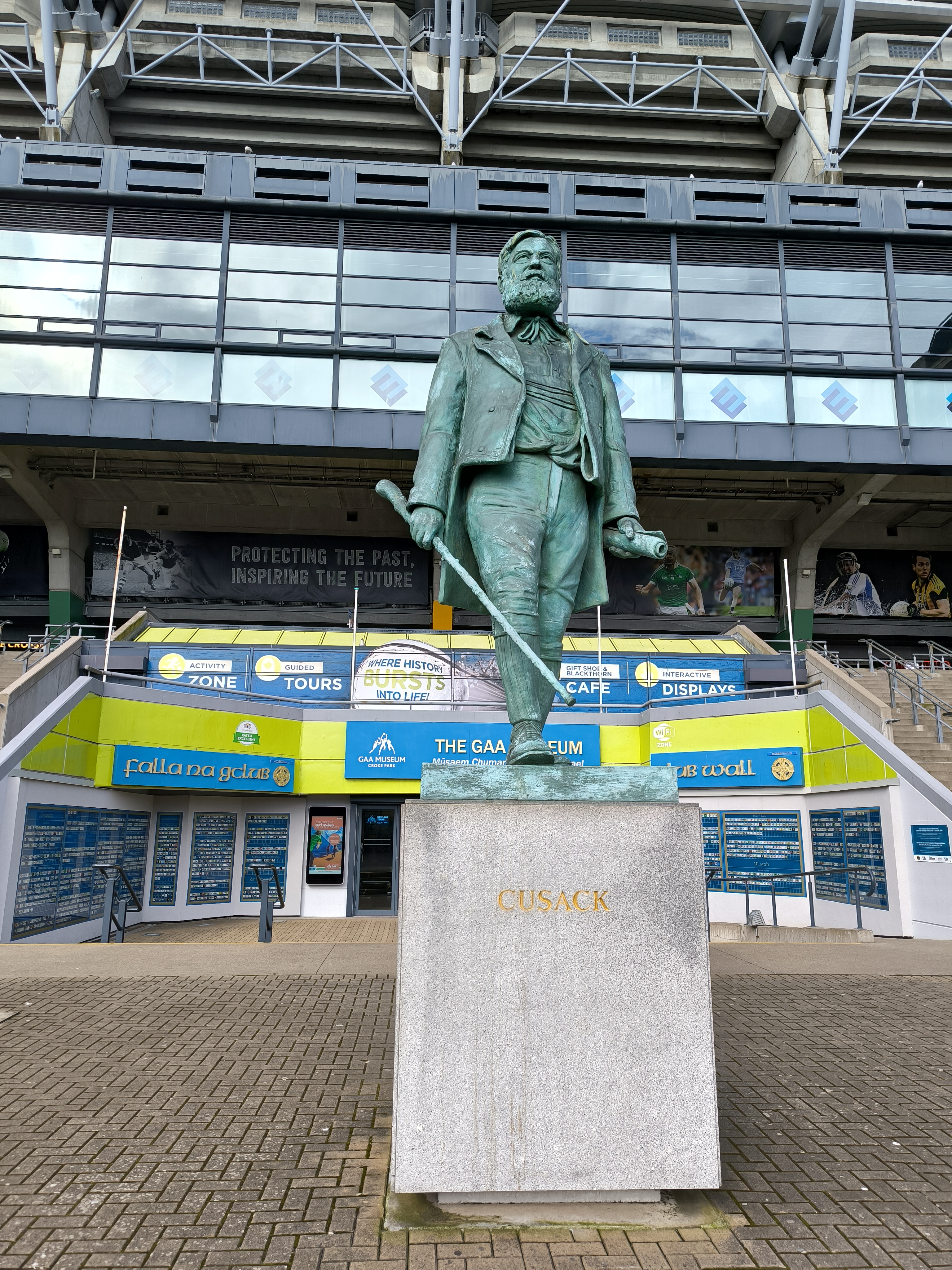En la entrada principal de Croke Park hay una estatua de Michael Cusack, el maestro que impulsara la constitución en 1884 de la Gaelic Athletic Association, portando un shillelagh o bastón tradicional irlandés. La GAA -así se la conoce- es la más importante de las asociaciones deportivas del país. Su constitución está firmemente entroncada con el irredentismo feniano de finales de siglo XIX y tenía y tiene unas normas muy estrictas. Para empezar: Nadie puede vivir de practicar un deporte gaélico porque el profesionalismo está prohibido. Además, atendiendo a su vinculación con el nacionalismo, la norma 27 impedía a cualquier miembro de la GAA participar -aunque fuera mirando- de algún deporte no gaélico. No hacía excepciones. Douglas Hyde, patrón de la GAA y además presidente de la República, fue expulsado en 1938 por asistir a un partido internacional de fútbol en Dalymount Park entre Irlanda y Polonia. Esa norma no existe desde 1971. Tampoco tiene vigencia ya la regla 21, que impedía que cualquier policía británico pueda formar parte de la GAA. Se abolió en 2001. La que sí sigue teniendo vigencia, aunque con excepciones, es la 42, que impide que en estadios como Croke Park se juegue a cualquier deporte no gaélico e “invasor”, como conocen los irlandeses más furibundos al rugby y al fútbol-soccer. El 16 de abril de 2005, el congreso de la GAA decidió permitir que se jugara en Croke Park a fútbol y rugby internacionales mientras el campo de fútbol de Lansdowne Road estaba cerrado por remodelación. El primer partido no gaélico celebrado en ese estadio fue un Irlanda-Francia del Seis Naciones de Rugby.