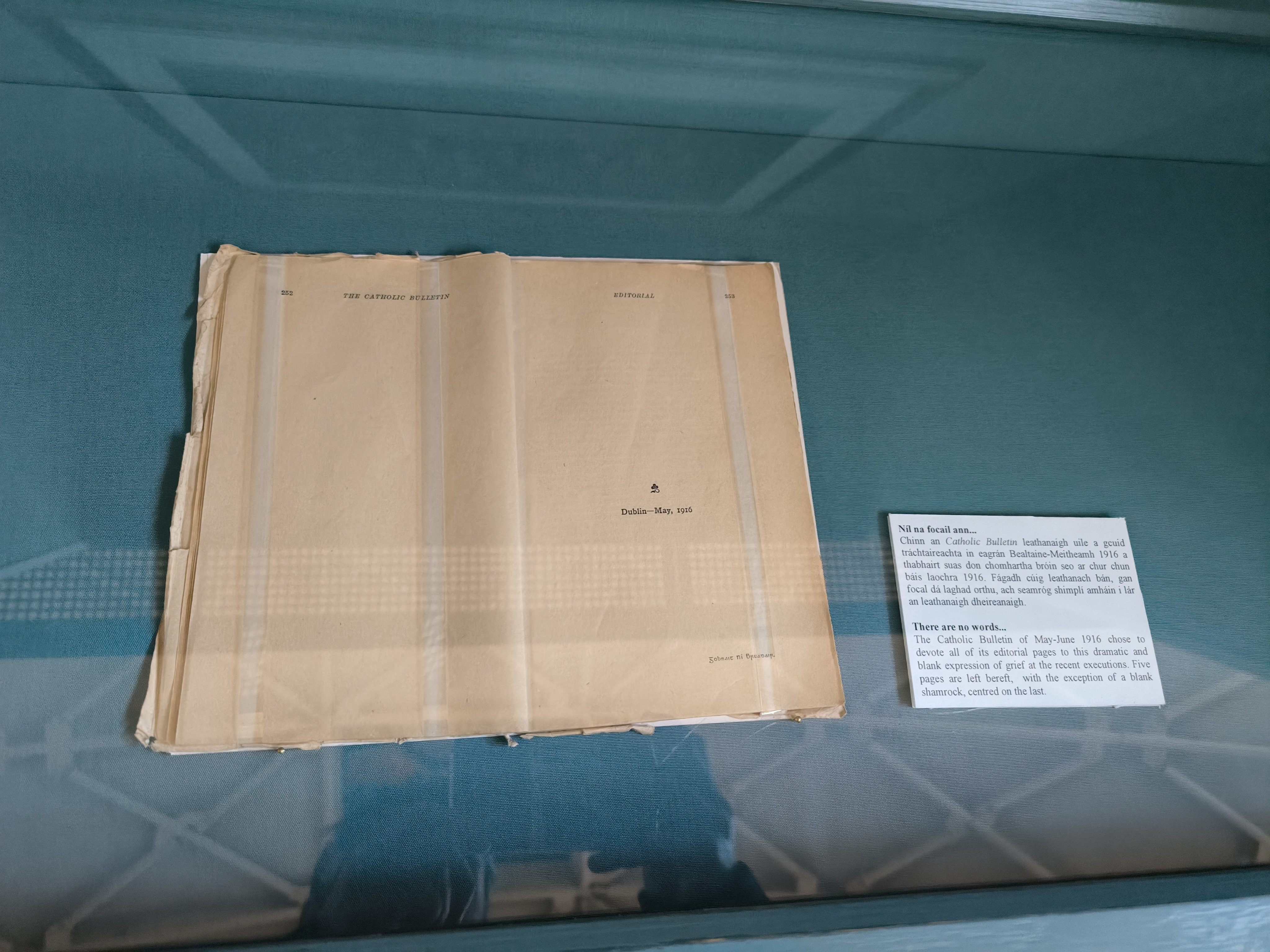 Se puede ver un ejemplar del Boletín Católico de mayo y junio de 1916 en el que, en memoria de los ejecutados, las cinco primeras páginas quedaron en blanco salvo por un pequeño trébol negro colocado en el centro. También se pueden visitar las celdas en las que se alojaron algunos de esos ilustres presos y otros como Eamon de Valera, que se libró de su fusilamiento por ser medio norteamericano (y medio español, aunque eso no le hubiera servido de mucho). Me llamó la atención la falta de sensibilidad de algunos turistas indios que se hacían fotos sonrientes y haciendo tonterías entrando y saliendo de habitáculos en los que tanto miedo y dolor se habría sentido. Recordé en ese momento el extremo respeto que nos pedían en su país por las vacas.